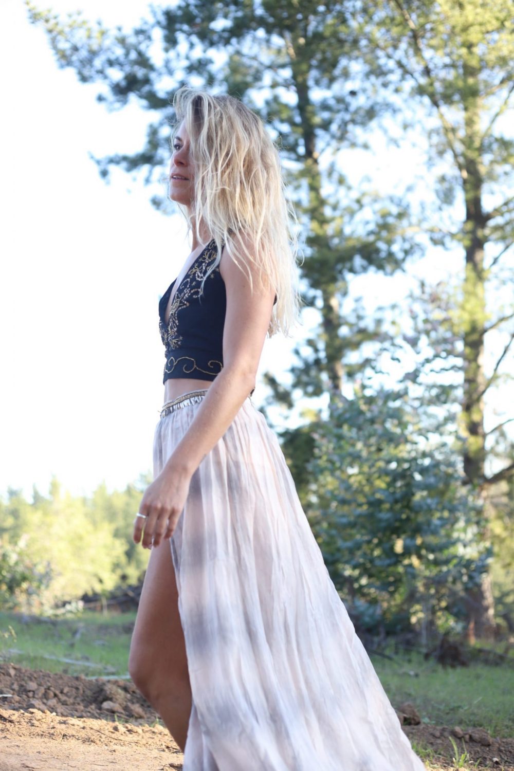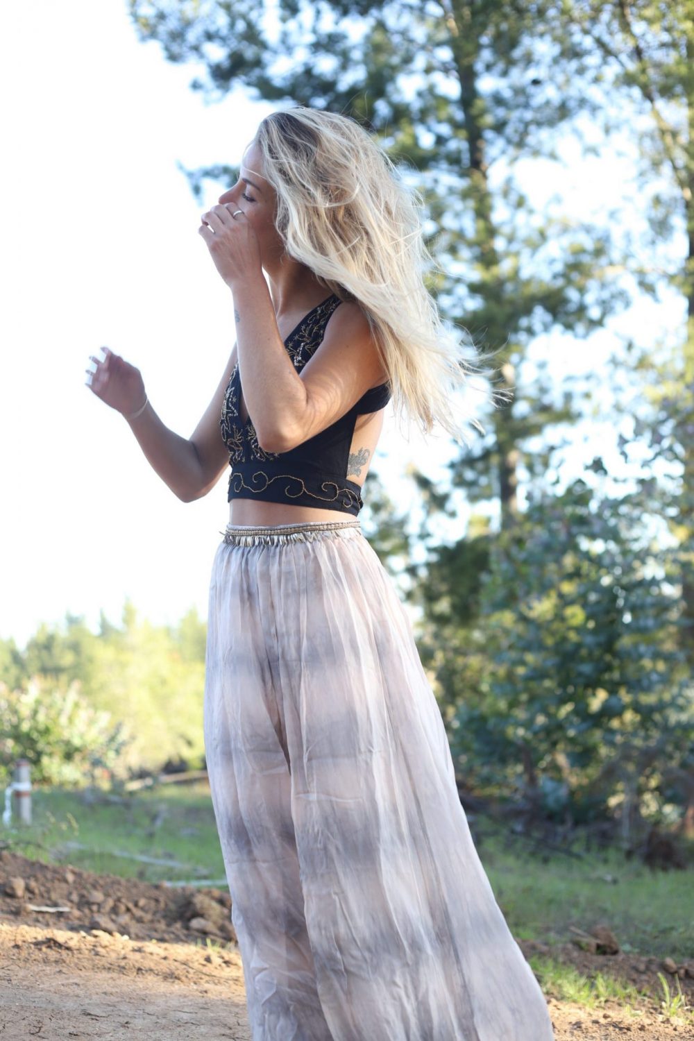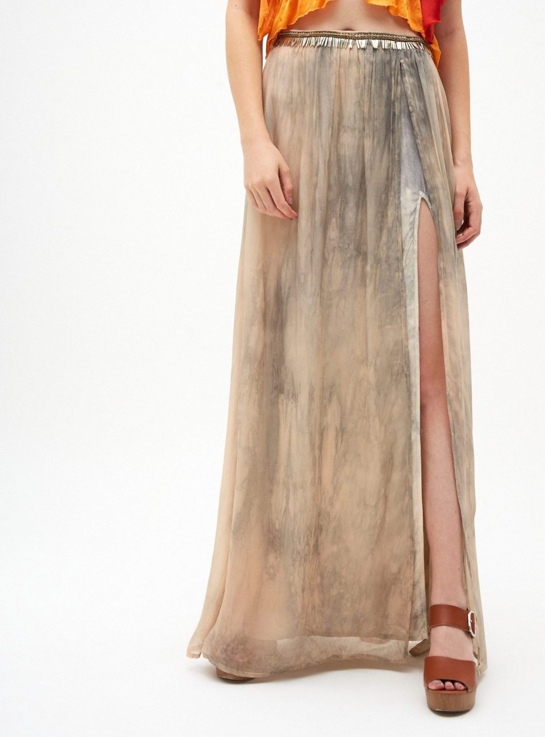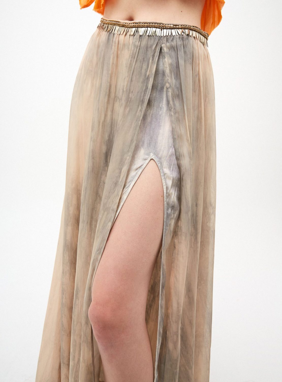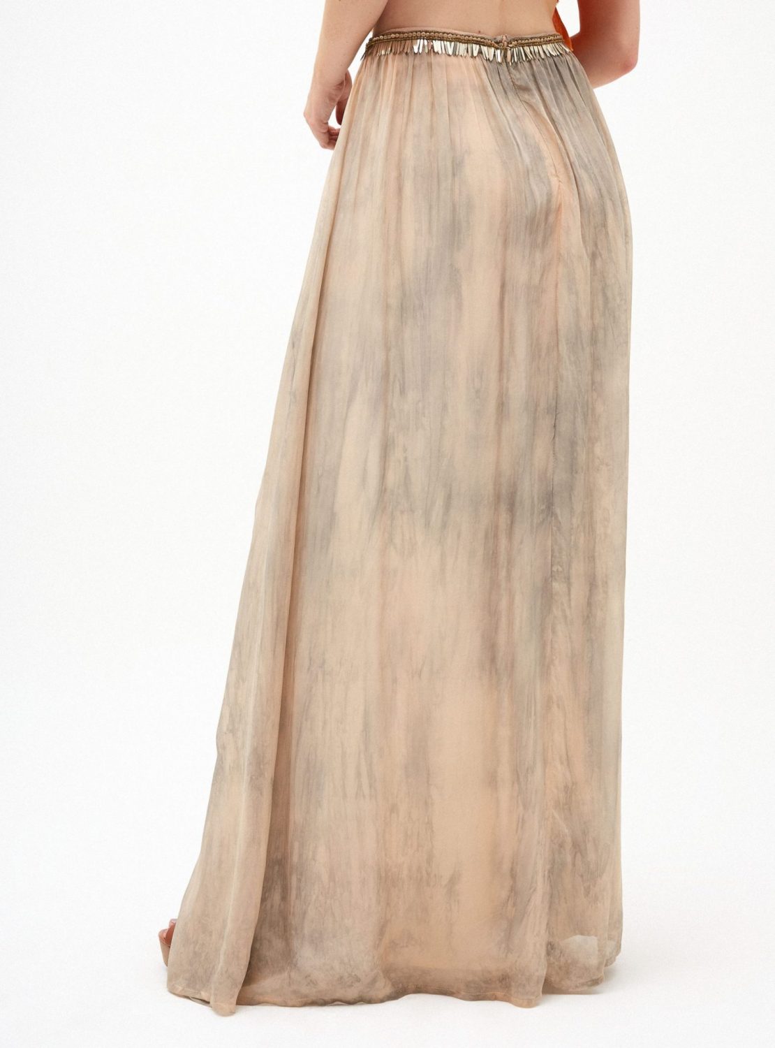 Falda de seda teñida artesanalmente en tonos rosados con detalles metalizados bordados en la pretina.