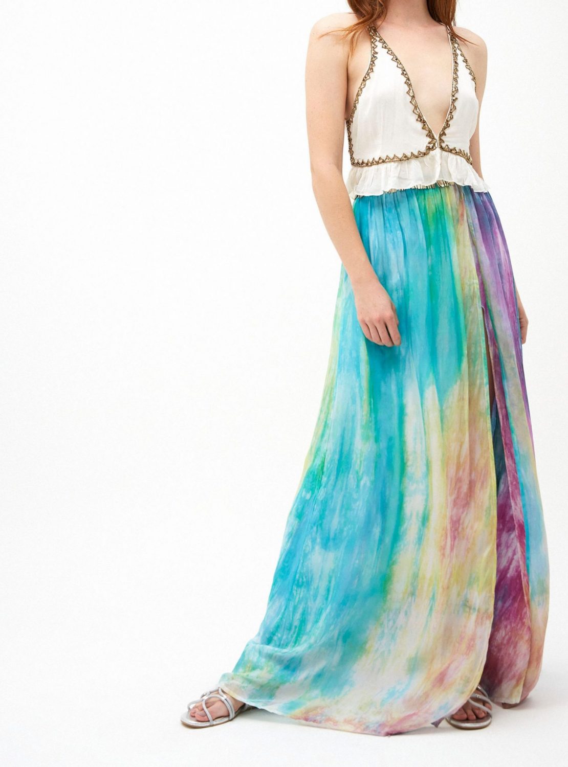 Falda de seda teñida artesanalmente en combinación de colores con detalles metalizados bordados en la pretina.