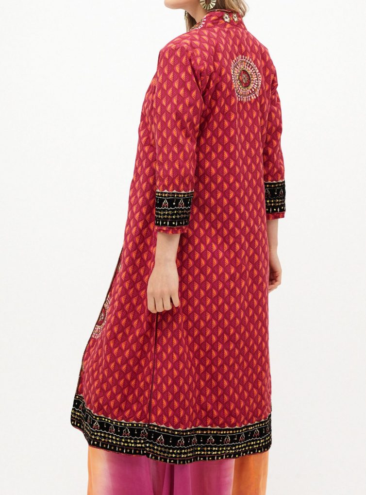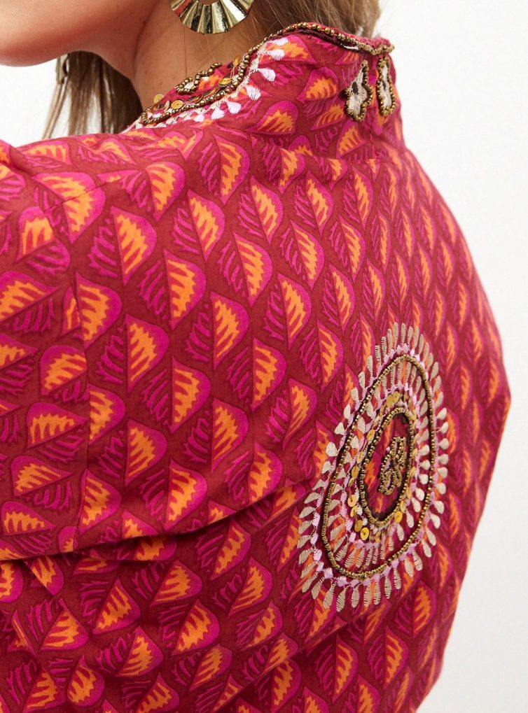 Kimono largo de estampado tribal en fucsia y naranjo con aplicaciones en terciopelo y mostacillas bordadas.