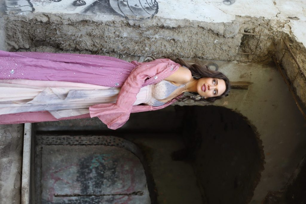 Kimono de satín seda malva totalmente bordado en mostacillas.