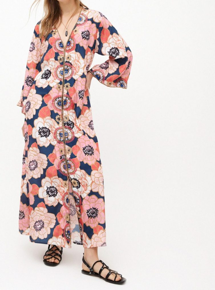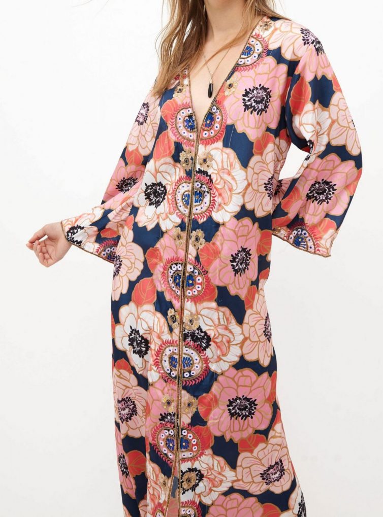 Kimono largo de satín seda estampado floral con aplicaciones bordadas en mostacillas.