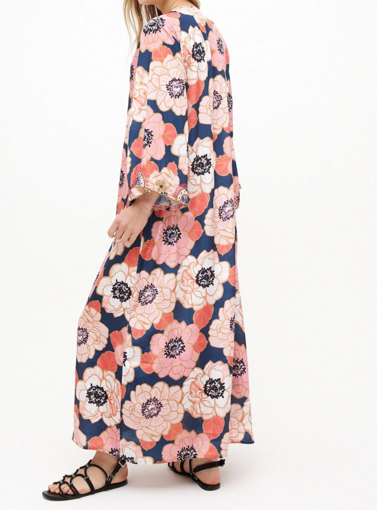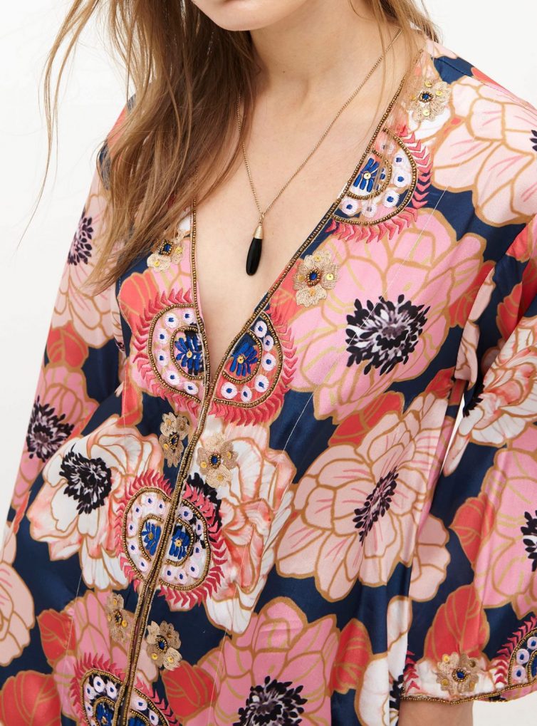 Kimono largo de satín seda estampado floral con aplicaciones bordadas en mostacillas.