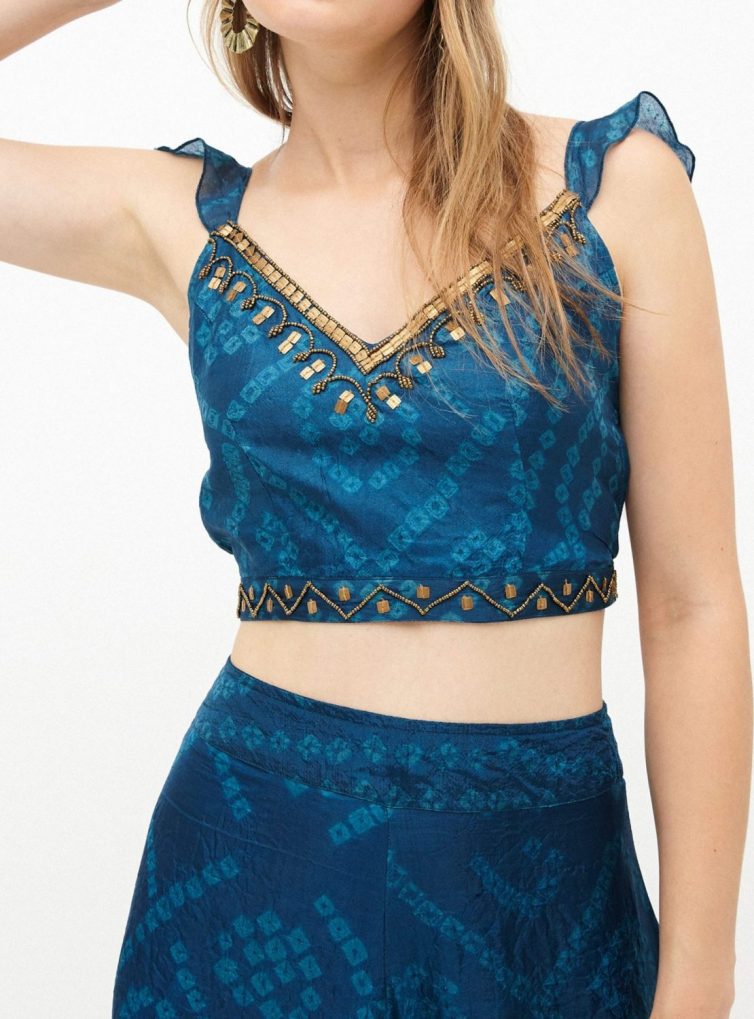 Top de seda teñida artesanalmente con aplicaciones bordadas en escote y cintura.