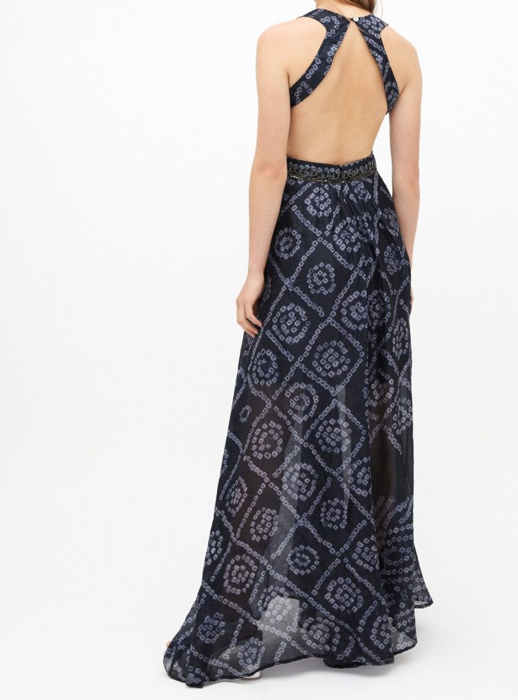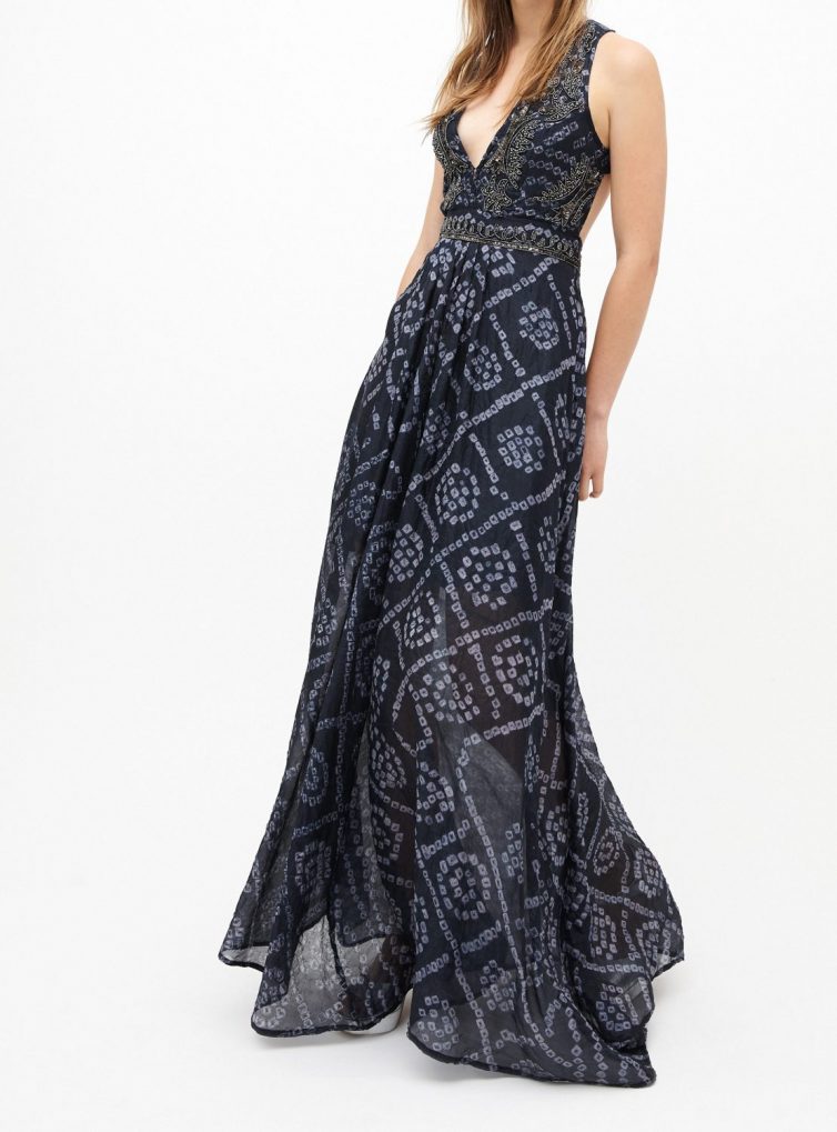 Maxi vestido de fiesta elaborado en seda teñida artesanalmente, con escote en “v” y cintura bordados en mostacillas y lentejuelas.