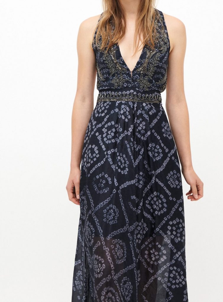 Maxi vestido de seda teñida artesanalmente, con aplicaciones de mostacillas y lentuelas bordadas a mano en el escote y cintura.