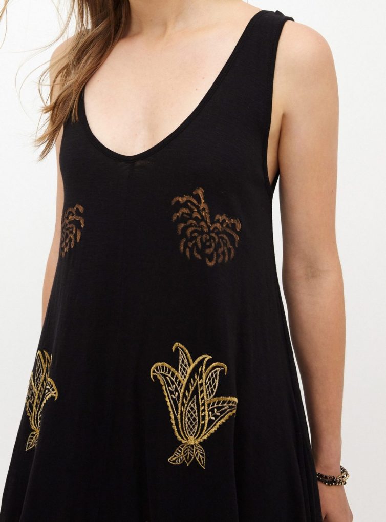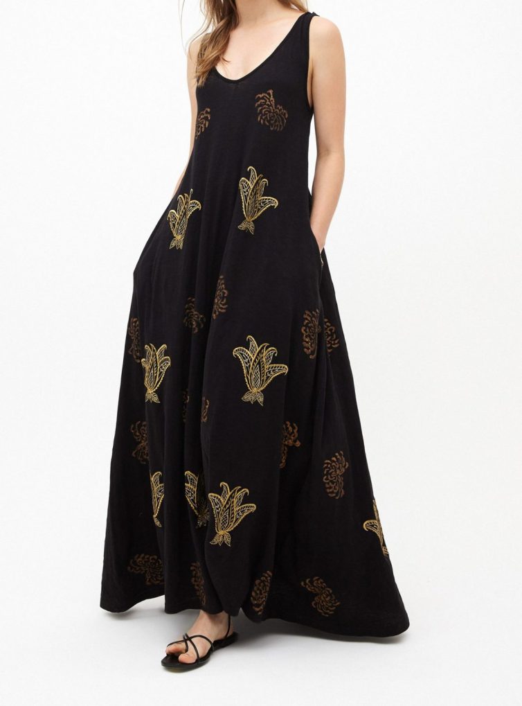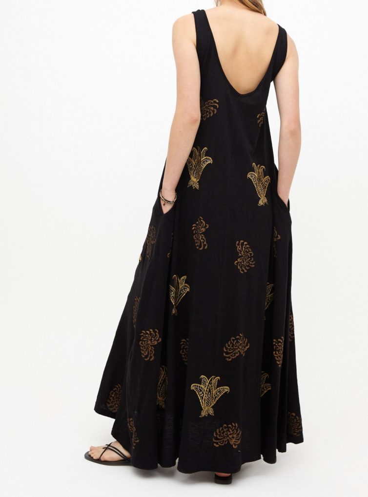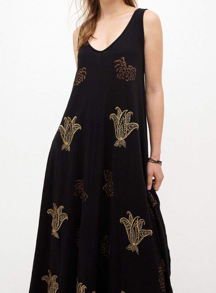 Maxi vestido de algodón, con estampados de flores y bordados en dorado.