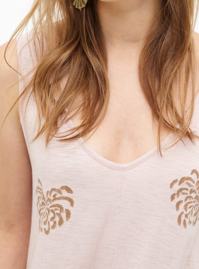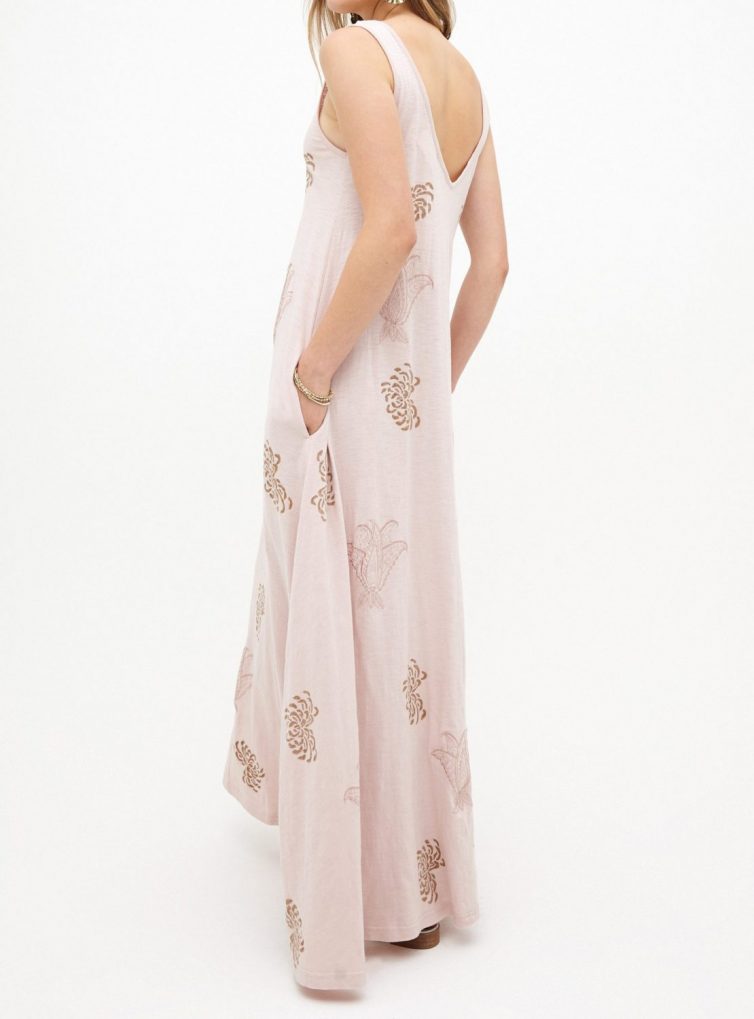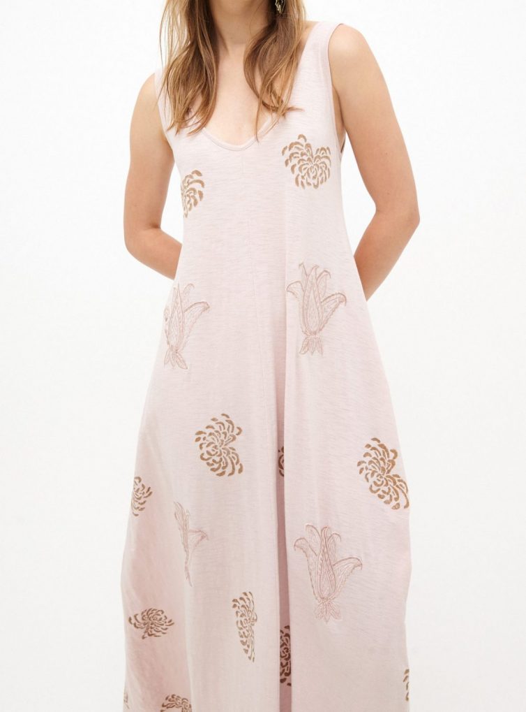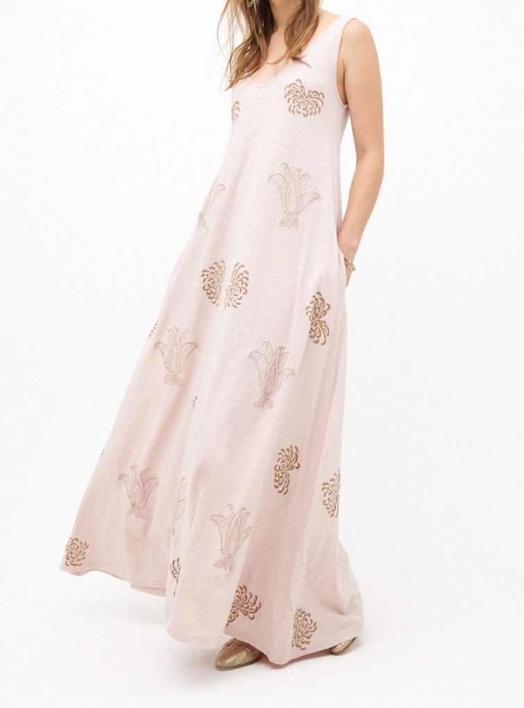 Maxi vestido de algodón, con estampados de flores y bordados en dorado.