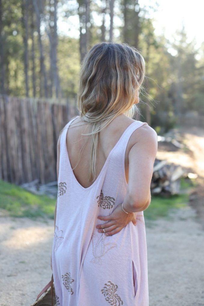 Maxi vestido de seda teñida artesanalmente, con aplicaciones de mostacillas y lentuelas bordadas a mano en el escote y cintura.