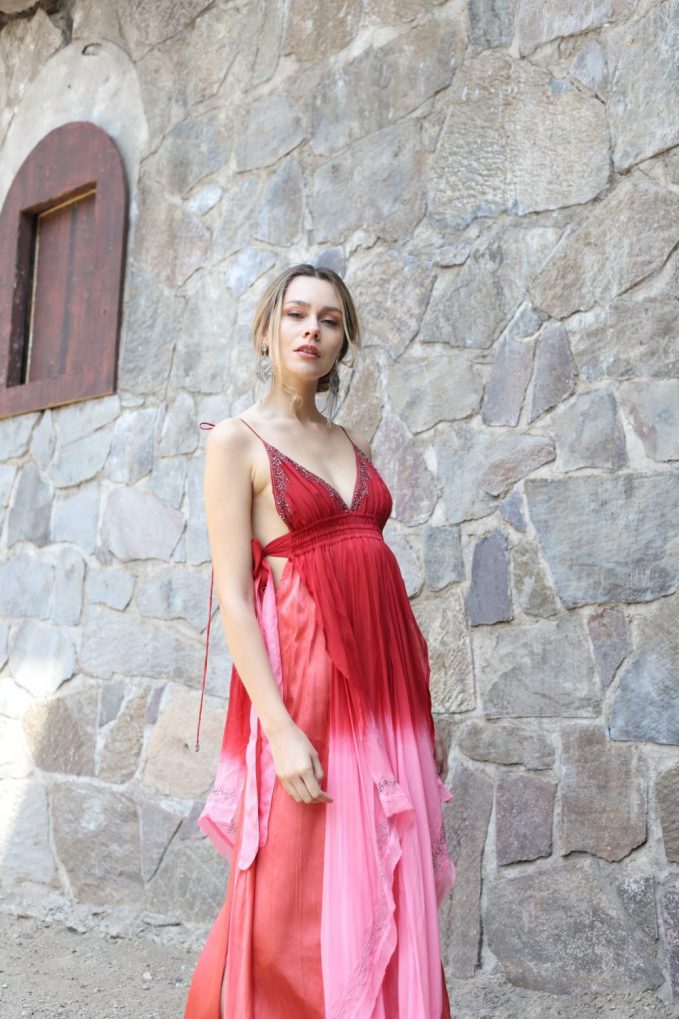 Maxi vestido de seda teñida artesanalmente, con aplicaciones de mostacillas y lentuelas bordadas a mano en el escote y cintura.