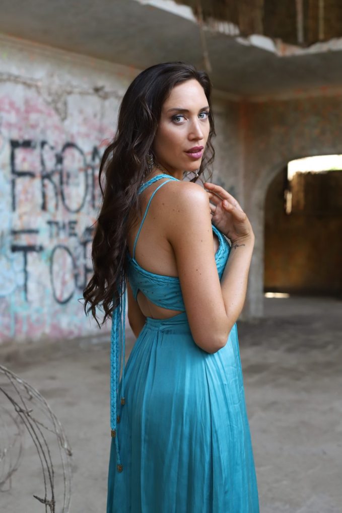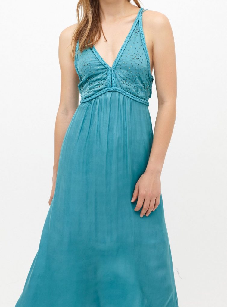 Maxi vestido de seda teñida artesanalmente, con aplicaciones de mostacillas y lentuelas bordadas a mano en el escote y cintura.