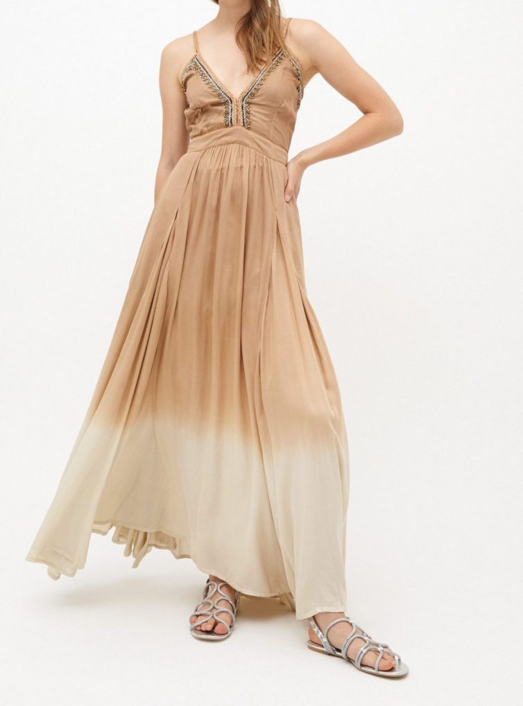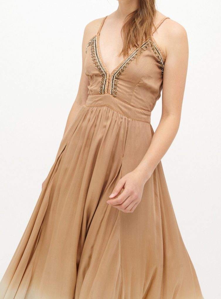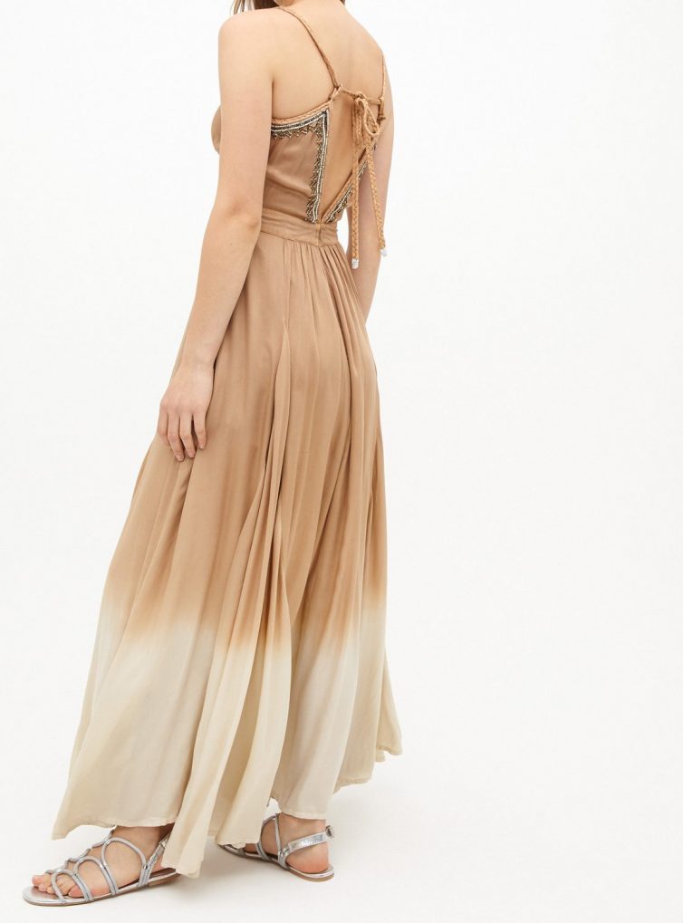 Maxi vestido de seda teñida artesanalmente, con aplicaciones de mostacillas y lentuelas bordadas a mano en el escote y cintura.