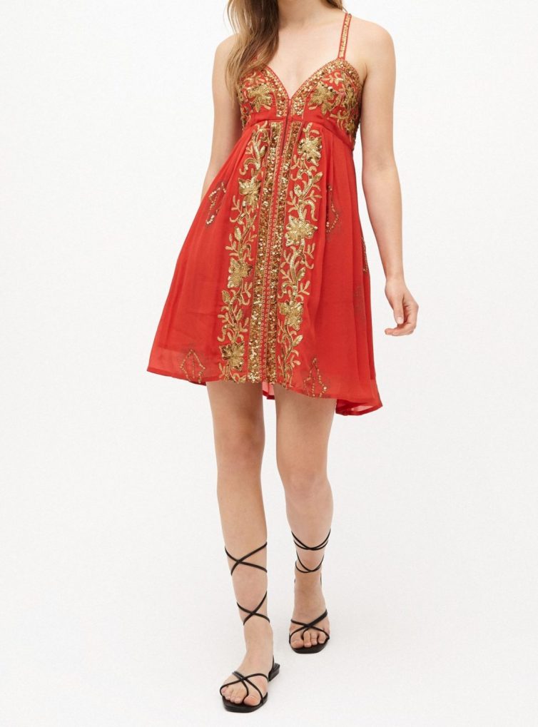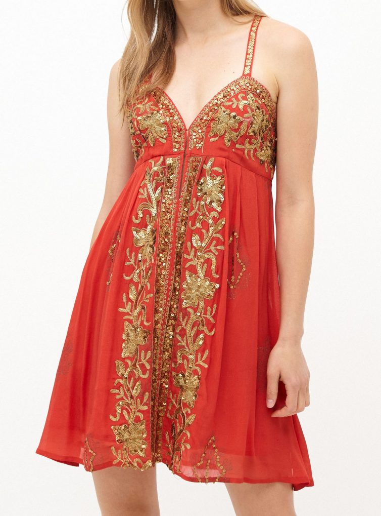 Mini vestido de crepe, con lentejuelas doradas bordadas en el escote acorazonado y frente.