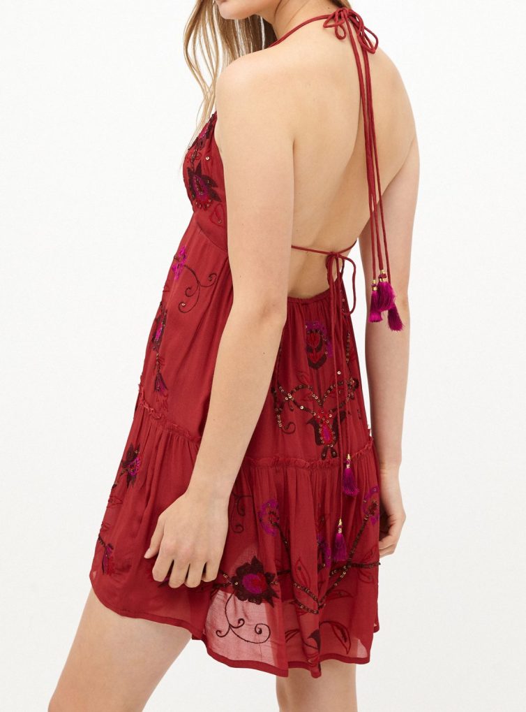 Mini vestido de crepe, con escote halter y flores bordadas a mano.