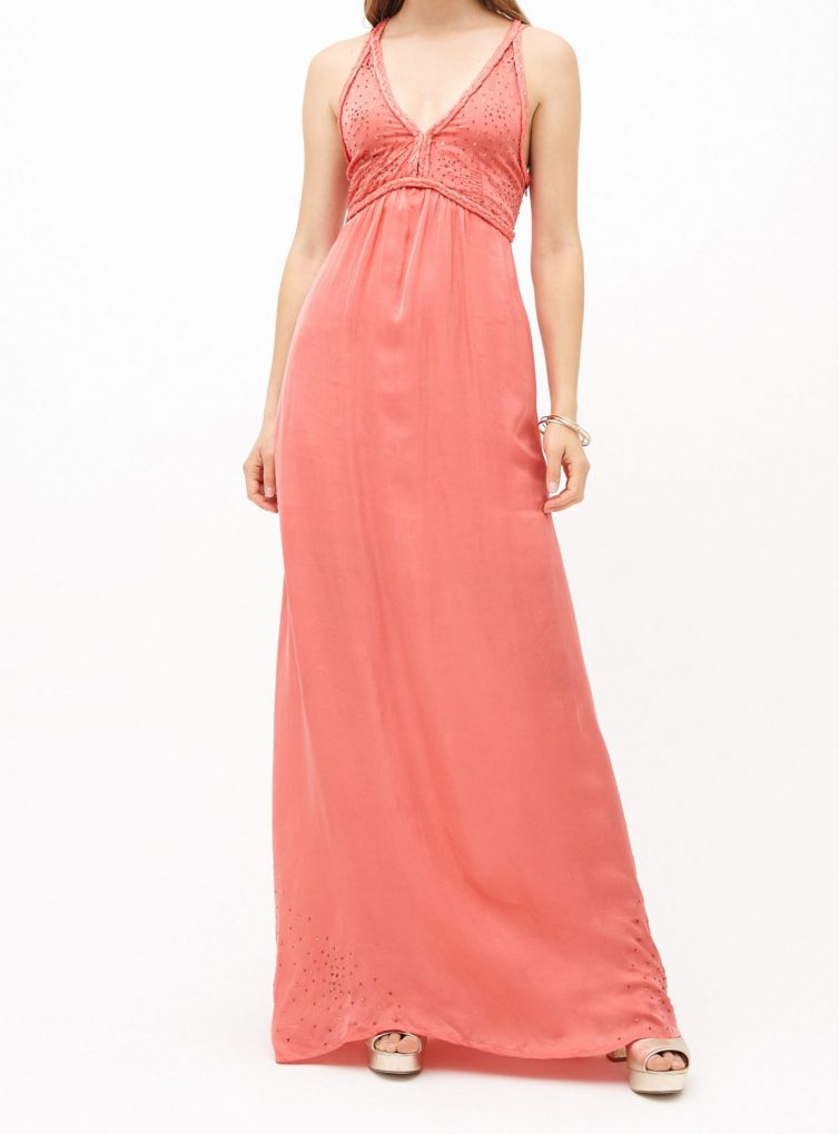 Maxi vestido de seda teñida artesanalmente, con aplicaciones de mostacillas y lentuelas bordadas a mano en el escote y cintura.