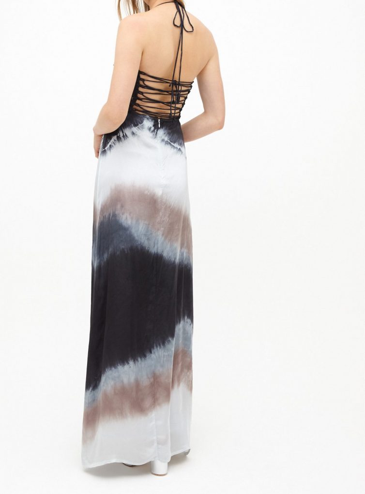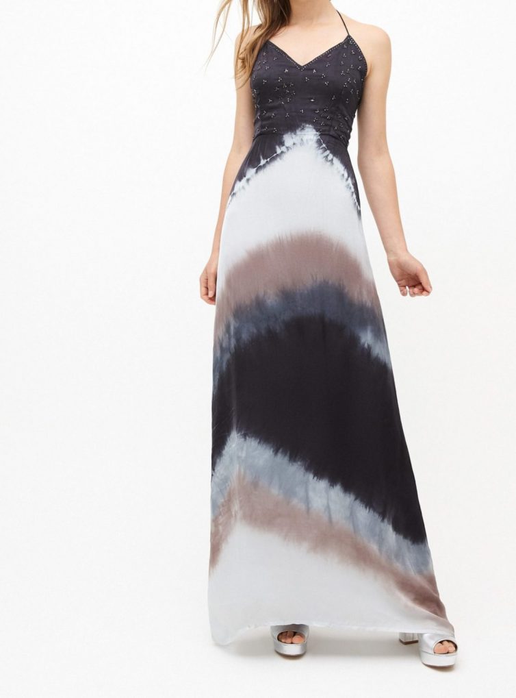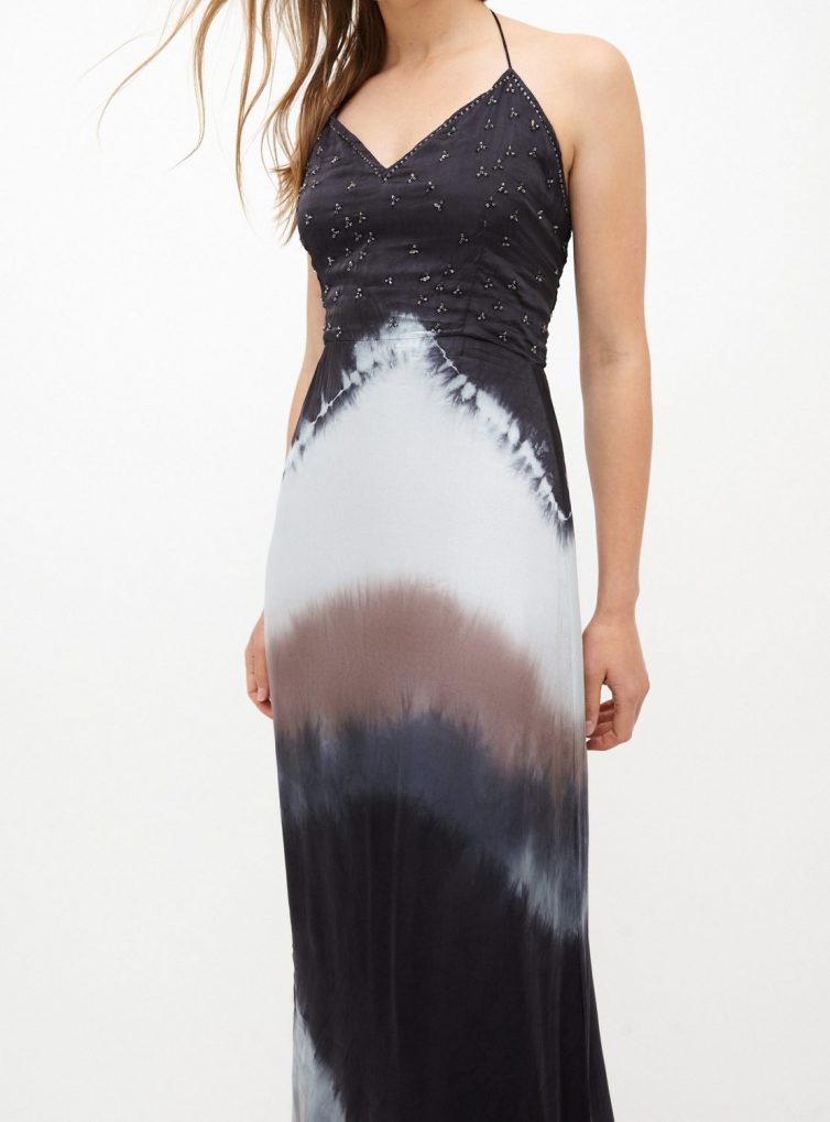 Maxi vestido de satín seda teñida artesanalmente en tonos grises, con aplicaciones de mostacilla bordadas en todo el escote.